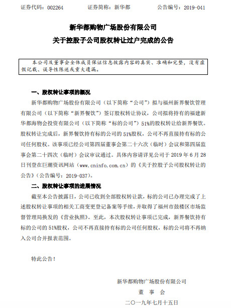 7月16日,新华都购物广场股份有限公司发布“关于控股子公司股权转让过户完成“的公告:与福州新界餐饮管理有限公司签订股权转让协议,新华都将持有的福建新华都海物会投资有限公司51%的股权转让给新界餐饮,新华都不再直接持有标的公司(即海物会)任何股权,标的公司将不再纳入新华都合并报表范围。