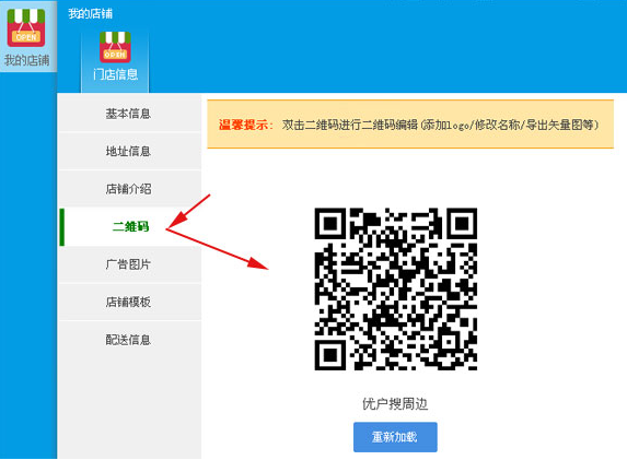 点击[我的店铺]--二维码,用你的微信扫一扫上面的优户搜周边二维码。