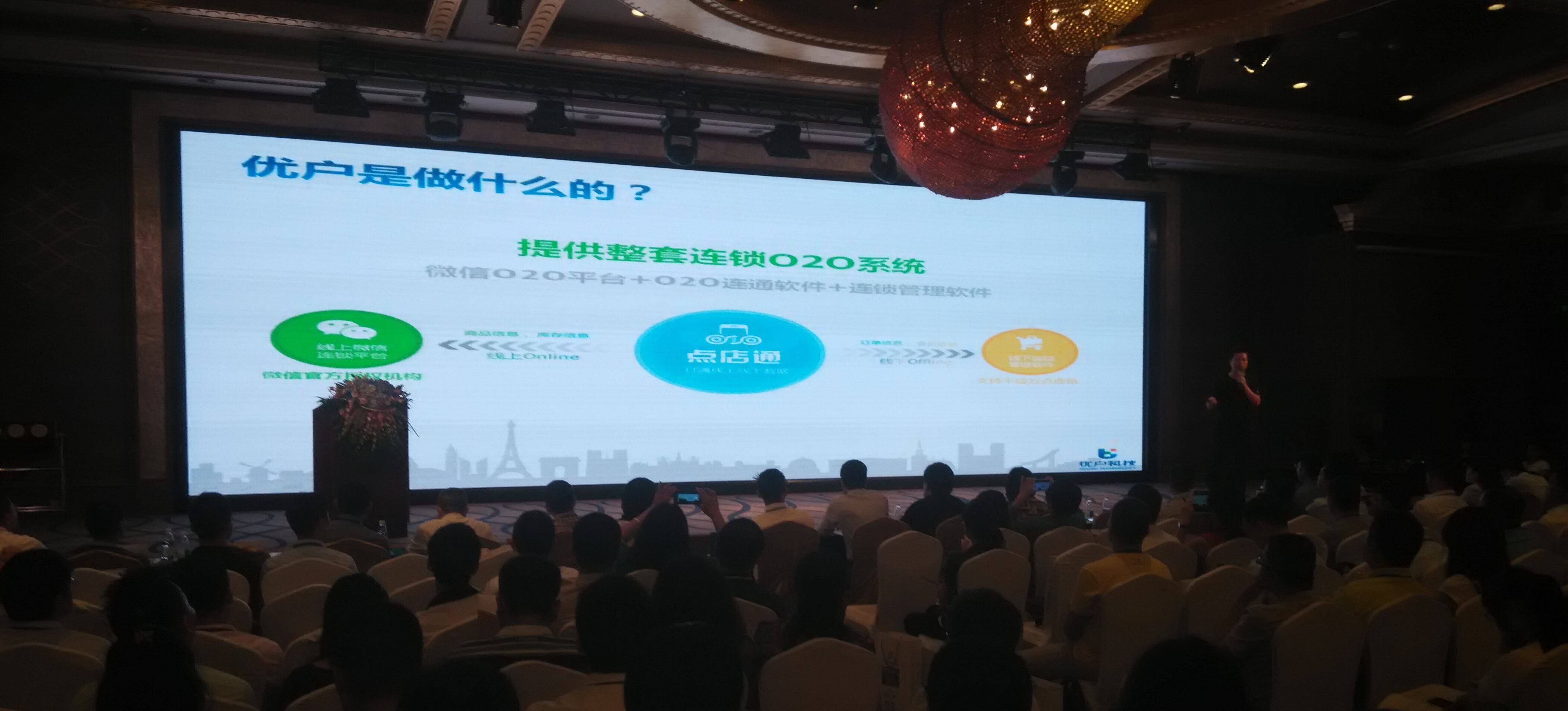 优户科技很荣幸参与了这场服务商和服务商、服务商和品牌商之间分享、交流和探讨的盛会,从中感受到零售和连锁企业对转型升级的渴望,以及对新技术、新服务的迫切需求。在大会上,优户科技总经理钟南星向大家介绍了连锁O2O平台系统,这是优户科技从成立至今一直在专注做的一件事情,就是做连接,帮助企业打通线上线下,这也是优户科技的核心技术,已帮助多家连锁企业完成系统升级,实现了O2O连锁经营模式。